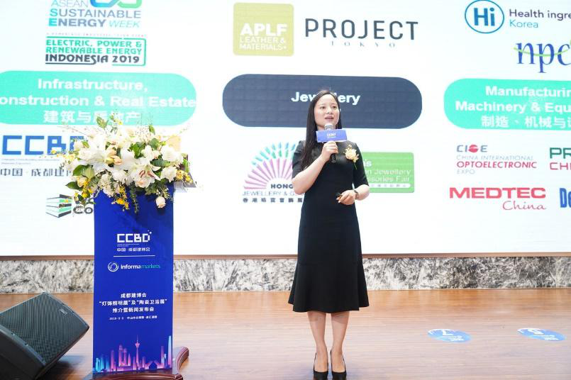 发布会首先由英富曼Informa Markets中国董事总经理龚康康发表致辞,她指出,成都建博会与英富曼集团牵手已经三年了,无论是从展会的规模还是影响力上都获得很大的提升。这次我们与中国建筑材料流通协会共同打造“灯饰照明”和“陶瓷卫浴”两个全新的板块,相信一定能让成都建博会如虎添翼,不仅保持在中西部首屈一指的地位,也将成为在全国极具影响力的重点品牌展会。